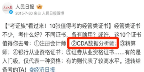 人工智能已成为当前最受关心的范畴,数据阐发能力已成为浩繁行业的主要技术。正在IT岗亭晋升中具有参考价值。良多金融机构的手艺岗会优先考虑CDA持证人。有价值的技术证书可以或许无效填补简历上的空白。会被算进人才引进积分系统!